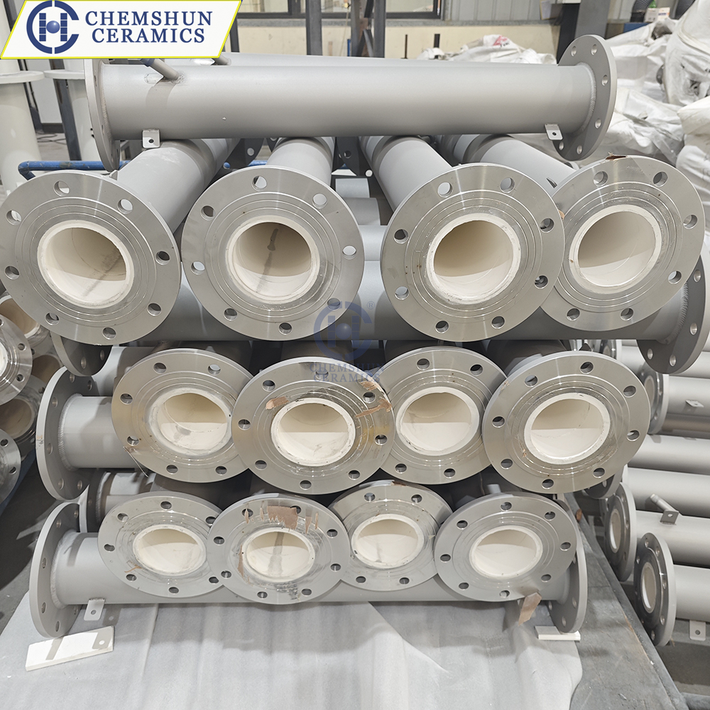 Alumina ceramic lined steel pipe is a high-performance composite pipeline manufactured by securely bonding high-purity alumina ceramic to the inner wall of a steel pipe. The ceramic layer typically contains no less than 95% alumina (Al₂O₃), with a Rockwell hardness of above HRA85 and a Mohs hardness of approximately grade 9, second only to diamond. This structure combines the high wear resistance of alumina ceramic with the strength and toughness of steel, making it suitable for severe abrasive conditions. Pipeline designs comply with engineering standards and allow customization in length, diameter, and connection methods.
